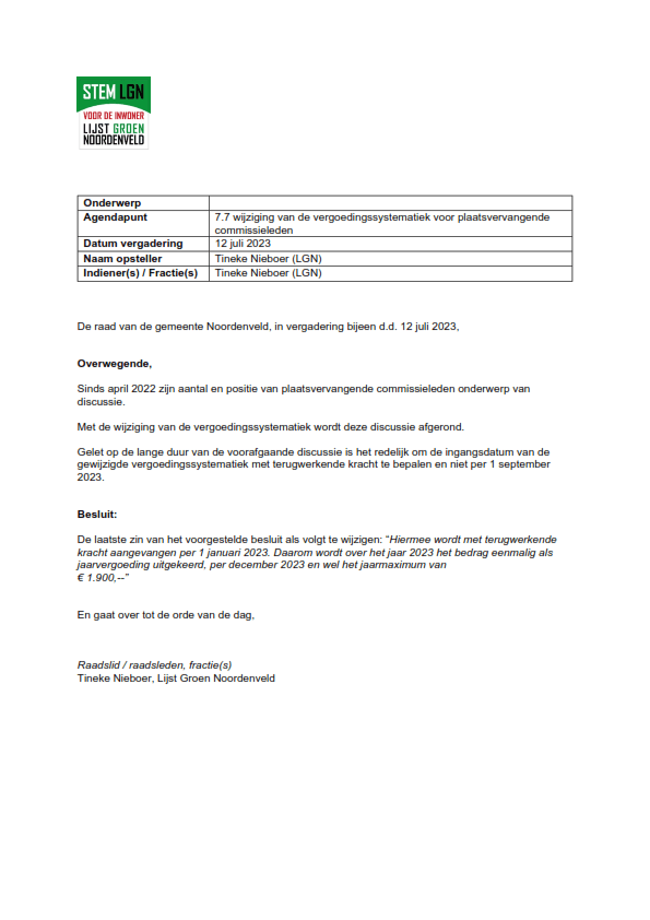 Dit amendement is met 6 stemmen voor (LGN, CU, PvdA/GL) en 12 tegen (GB, VVD, D66), niet aangenomen op 12 juli 2023.