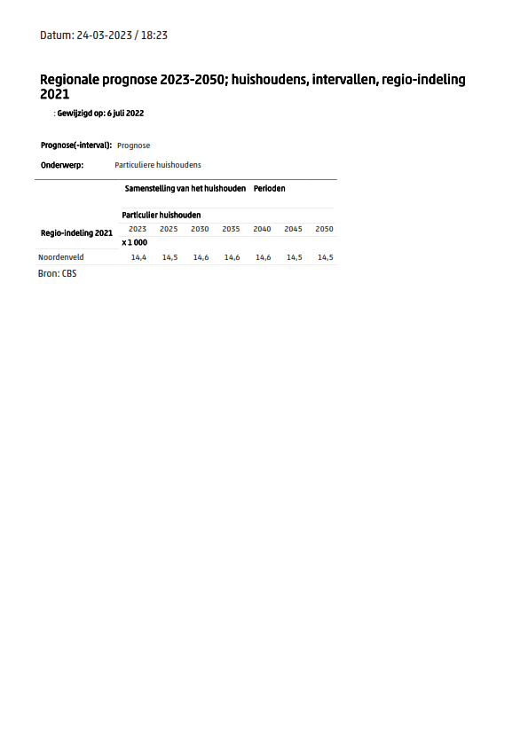Het CBS verwacht 14.600 huishoudens in 2030, dat zou ten opzichte van 2020, 679 huishoudens erbij zijn. De Primos prognose 2020 ging uit van 14.500 huishoudens in 2030, dat zou 579 erbij zijn ten opzichte van 2020. De landelijke prognoses zien dus een lagere groei van het aantal huishoudens dan het maximum van 1.075 dat in november/december2020 in de gemeenteraad aan de orde is geweest. Daarbij gaan de landelijke prognoses ook nog uit van een te hoog aantal huishoudens bij de start: het CBS hanteert 14.400 begin 2023 terwijl er gelet op voorgaande jaren (hoogste stijging was 162) geen toename van 380 huishoudens in 2022 (begin dat jaar waren er 14.020 huishoudens) kan zijn. De Primos prognose gaat uit van 14.020 begin 2020, terwijl dat er 13.911 waren. De groei in de prognoses is dan ook 200 á 300 in 8 jaar, dan wel 480 in 10 jaar. Uitgaande van de 480 in 10 jaar zijn er met 109 woningen erbij in 2020 en 2021, nog 371 extra nodig tot 2030 voor heel Noordenveld.