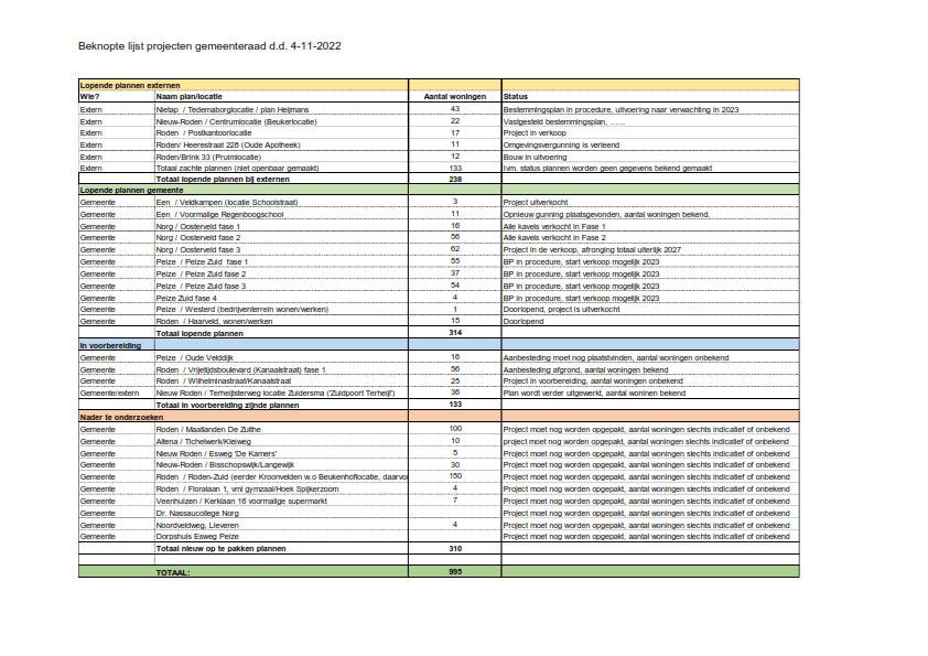 Totaal alleen al in en rond Roden zo’n 340 woningen, van de benodigde 371.
