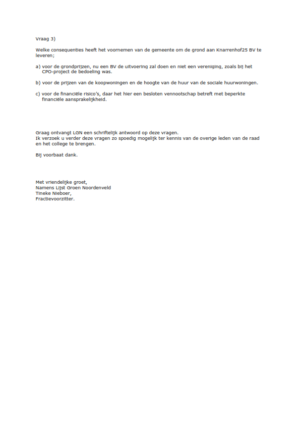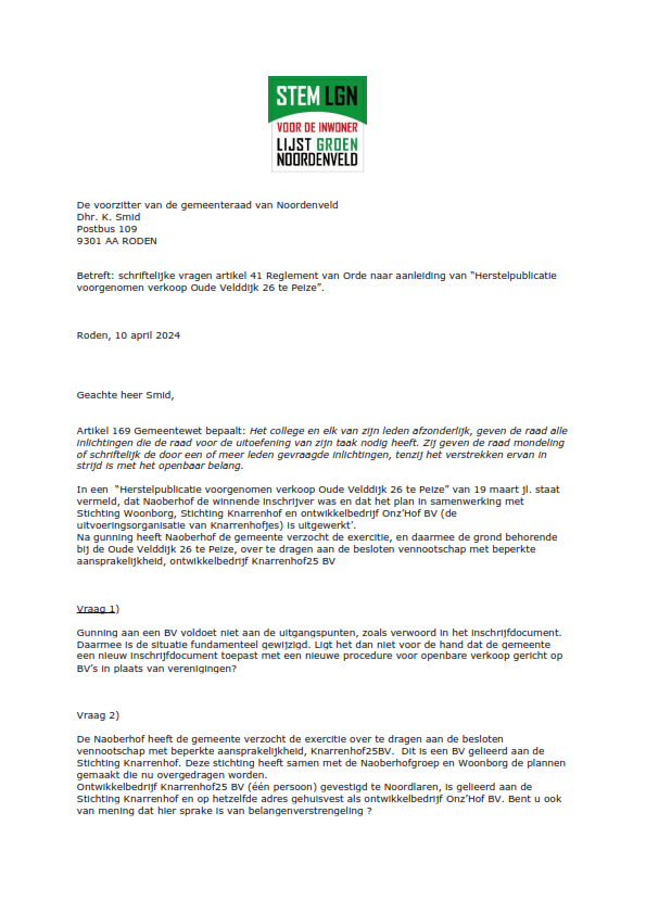 De openbare verkoop startte al in december 2022 met een gunning aan de eniginschrijver in april 2023. Volgens de website van de gemeente is dat de organisatie "Naoberhof". Blijkbaar ziet die groep nu teveel financiële en organisatorische risico's en is er een BV opgericht. De gemeente wil het project nu aan die BV gunnen. De hele gunning was echter gericht op een CPO vereniging volgens het inschrijfdocument. Gunning aan een BV voldoet dus niet aan de uitgangspunten. LGN heeft hierover op 10 april 2024 de onderstaande vragen gesteld.